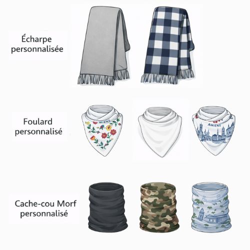 Nous proposons des écharpes personnalisées adaptées à tous les budgets, de la version simple et pratique au modèle premium, toujours 100% unique à votre image.